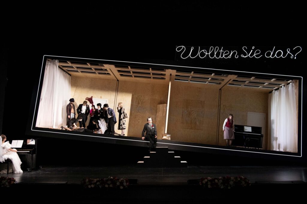 Regisseur Ingo Kerkhof zentraler Spielraum ist ein als Wippe gebauter Spielkasten. Er wippt elektronisch und verlagert damit zugleich die handelnden Gewichte der Räume innerhalb des Kastens. Mit dem davorliegenden ebenfalls genutzten Raum gelingt eine zweckdienliche Szenerie für aller drei Erzählelemente, den beiden Opern und der Rahmenhandlung der philosophischen Dialoge.