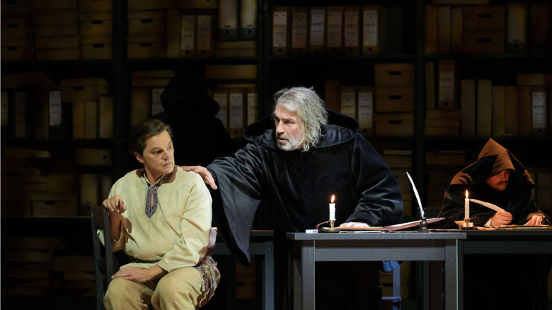 Gesanglich gab es recht deutliche Unterschiede. Der unumstrittene sonorste Sänger des Abends ist Andreas Bauer Kanabas als Pimen. Bei seinen ersten Tönen kann man unfreiwillig denken, dass hier der eigentliche „Boris Godunow“ singt. Sein orgelgleicher, substanzreicher, tief grundierter Bass strahlt in jeder Phrase Autorität, Weisheit und abgründige Tiefe aus. Er singt mit einer Souveränität und Klangfülle, die sofort an die große Tradition denken lässt und mühelos die Bühne beherrscht – ganz große Klasse, die stärkste Leistung des ganzen Ensembles.