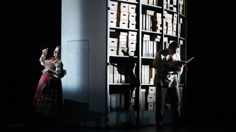 Eine Drehbühne zeigt permanent Vorder- und Rückseite der Macht; darüber thront ein überdimensionales Uhrwerk – als gigantische Projektion über Boris‘ Schreibtisch –, das unbarmherzig tickt und die Figuren zu Zahnrädern im Getriebe der Geschichte macht, ein unaufhörliches Räderwerk, das Verluste ignoriert. Kaspar Glarner baut daraus ein düster-prächtiges Bühnenbild ohne jeden folkloristischen Kitsch: zwei gewölbte, dreistöckige Elemente, die sich zu Palast, Kloster oder Straflager zusammenschieben lassen, auf der Rückseite jedoch nur triste, graue Betonwände preisgeben – ein gelungener Kommentar zur Fassade jeder Diktatur.