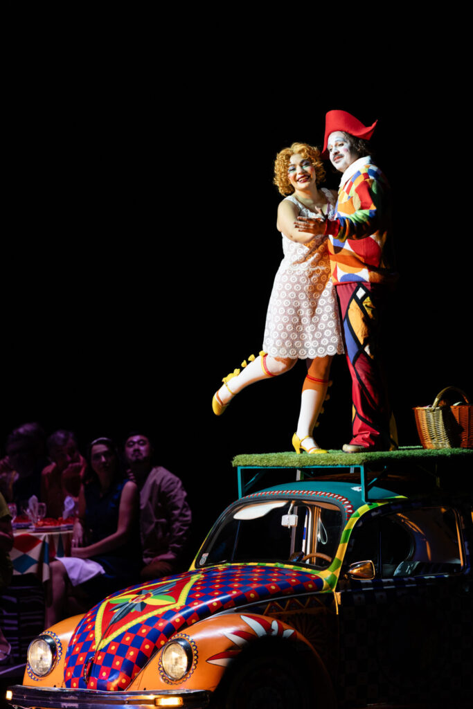 Ailyn Pérez sang die Nedda sehr gut und tanzte stimmlich mit Grandezza durch ihre Rolle. Ihr sanfter, doch äußerst selbstsicherer Sopran amüsierte das Publikum im Saal, führte ihre verschiedenen Liebhaber vor und ließ die Liebesszene mit ihrem Bauer Silvio mit großer Leidenschaft strahlen. Ihr gegenüber strahlte Thomas Mole als Silvio mit ebenso inbrünstigem Bariton die Bühne voll, das war eine absolute Luxusbesetzung für diese recht kleine, doch bedeutende Rolle! Gabriele Viviani sang einen routiniert souveränen Tonio und Andrés Agudelo einen sehr eifrig und lustigen Peppe, der sich scheinbar auch seinen Spaß in der Buhlerei um Nedda erlauben wollte.