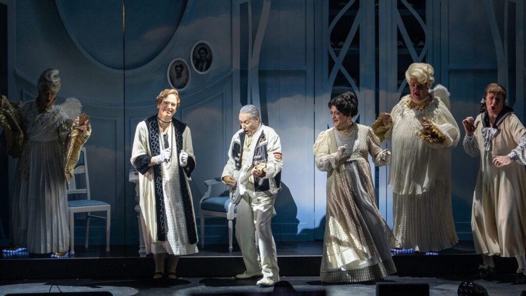 Divertissementchen 2026 © Stefanie Althoff – Ein Ständchen für Konrad Adenauer im Himmel: Queen Elisabeth II. (Peter Wallraff) an der Fanfare