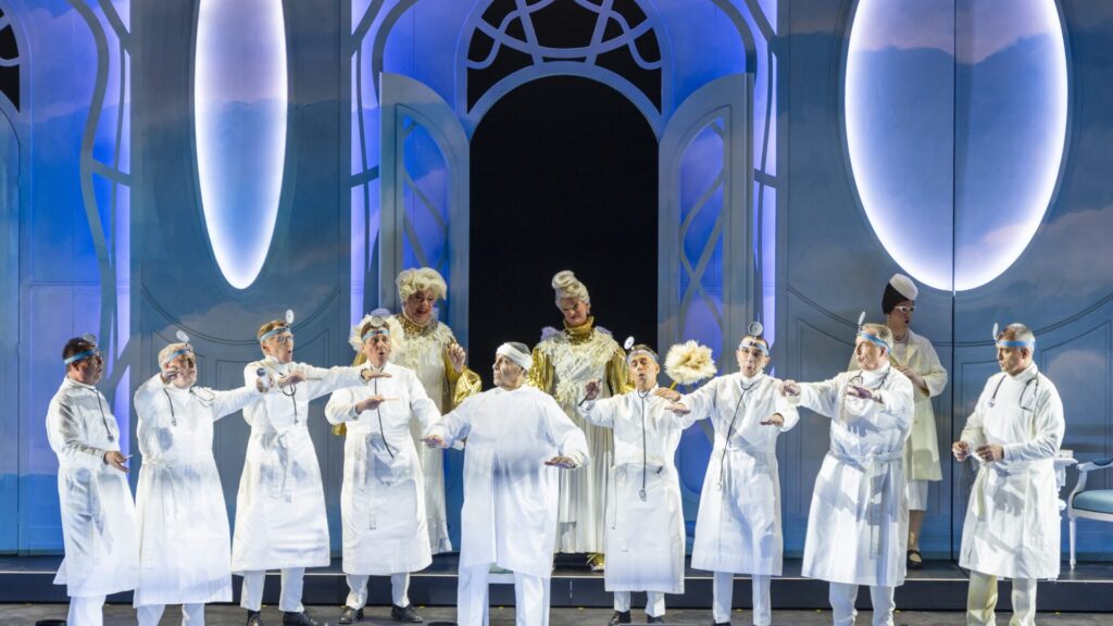 Divertissementchen 2026 – Szenenfoto 6 © Stefanie Althoff – Auch im Himmel achtet Konrad Adenauer (Jürgen Nimptsch, Mitte) auf seine Gesundheit und wird regelmäßig von einer fröhlichen Ärzteschar untersucht.