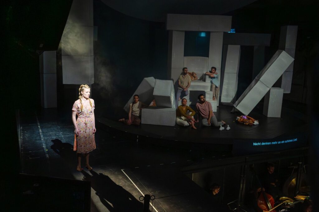 Die Oper wird vor der Pause vollständig aufgeführt. Doch der Abend ist damit nicht zu Ende. Denn aus einigen wenigen Elementen der Oper, Chiung-Wen Hsus Komposition nach Franz Schuberts „Der Tod und das Mädchen“ und dem Chorstück „In mir klingt ein Lied“ mit für Orchester arrangierter Chopin Etüde E-Dur mit Text von Alma Rosé wird eine Utopie angehängt. Chiung-Wen Hsus Version von „Der Tod und das Mädchen“ ändert die Tonalität der Arie des Trommlers, die an dieser Stelle von Noam Sabag Lahat mit seiner weichen Tenorstimme gesungen wird. Verzweifelt stoisch unentschlossen wirkt das dieses Mal auf mich. Der Krieg jeder gegen jeden funktioniert nicht mehr. Er ist aus. Die Utopie leuchtet warm und hell bei „In mir klingt ein Lied“. Der Chor singt die Menschen in ein menschwürdiges Dasein zurück. Der Abend endet mit den Worten, die mich bereits in der Oper getriggert haben: „und es wird der Tod zum Dichter, / wenn er sich mit Liebe eint.“