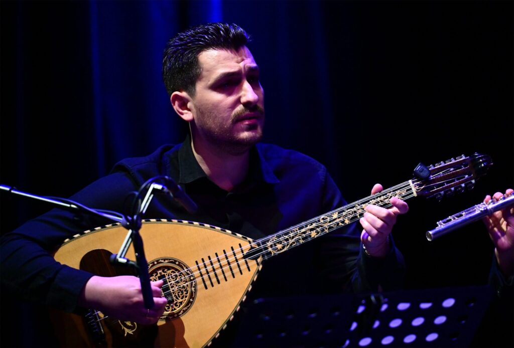 Die griechische Laute Vasilis Kostas’ hat die Form einer Laute, weniger Saiten als diese und das bauchige einer Oud. Mit ihr führt er das ensemble oktopus durch die Improvisation über Volksweisen, unter anderem Hava Nagila. Am Ende dann eine Passage aus Elgars Cellokonzert. Alles wird rhythmisch angefasst und einge-tont, neben den Instrumentenklängen auch das Holz der Instrumente, oder auch die Notenständer. Mit dieser Fusion der vieler Einflüsse, aus dem „Raum und Respekt für den anderen“ entspringt, so beschreibt es Kostas vor Beginn, endet der Abend. Ich fühle mich wunderbar erfüllt.