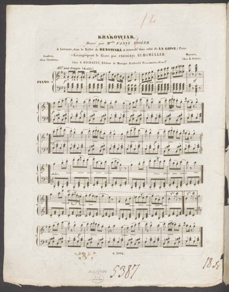 Friedrich Burgmüller (1806–1874), ein in Paris lebender deutscher Komponist, arrangierte diesen Krakowiak für Klavier. Zu seinem Werk gehören auch eine Cachucha und das Ballett „La Chatte métamorphosée en femme“. Fanny Elssler tanzte ebenfalls darin. Laut den Autoren des Buches schaffte sie sich sogar ein kleines Kätzchen an, um die Bewegungen dieses Tieres im Tanz nachahmen zu können.