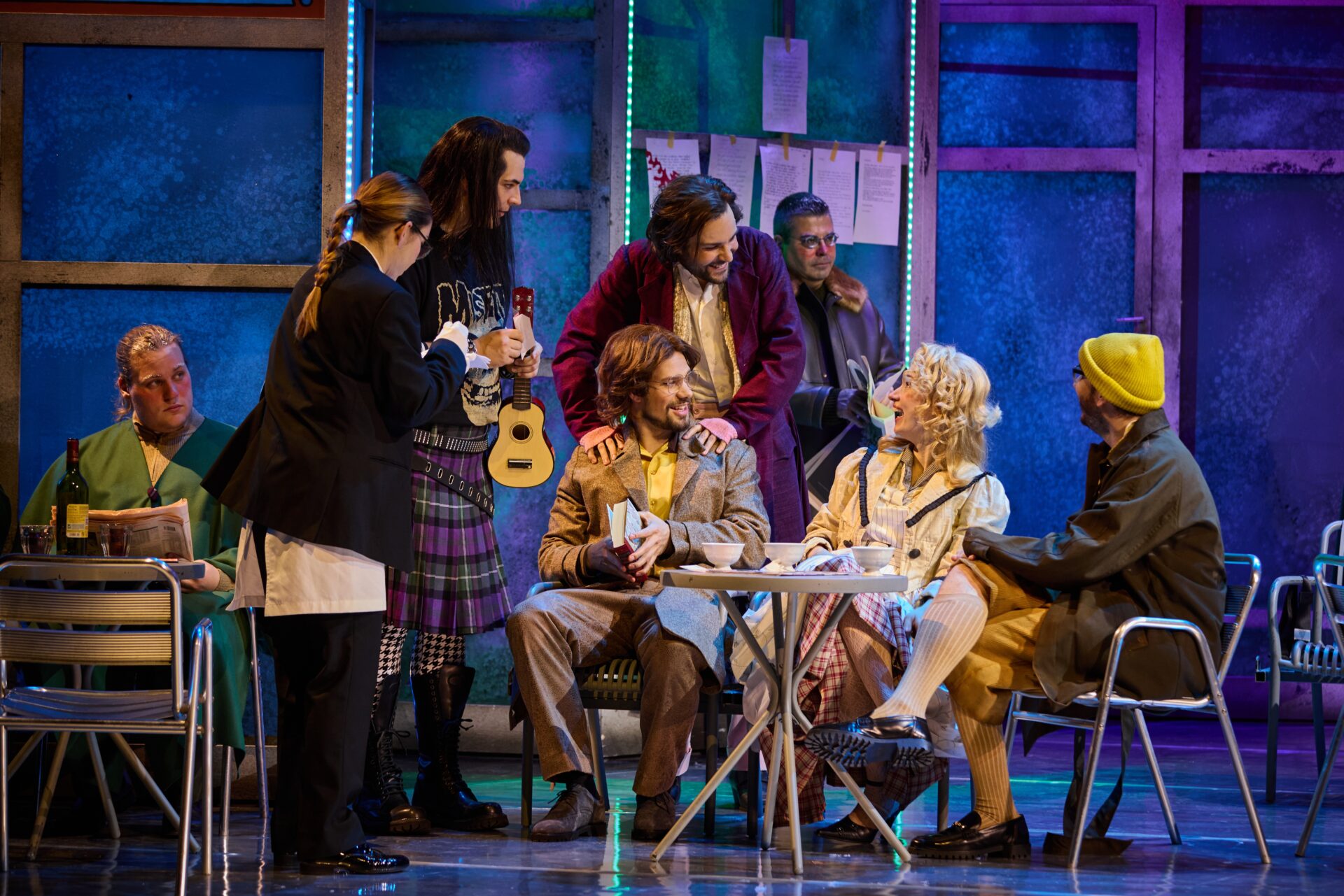 Vorheriges Bild Nächstes Bild La Bohème Foto: Ludwig Olah Auf dem Bild: Felix Gygli, Jonas Jud, Vincenzo Neri, Sylvia D’Eramo, Brian Michael Moore (v.r.n.l.), Chor des Theaters St.Gallen, Opernchor St.Gallen