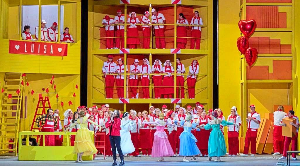 Das begann schon im ersten Akt mit einer gigantischen Szene aus irgendeinem Baumarkt, ganz in Schmelzkäse-Gelb und dem künstlerischen Personal in knallgelben Overalls gehalten. Folgerichtig wird die Geburtstagstorte für Luisa, fernab vom Tiroler Dorf der Story, mit einem Gabelstapler präsentiert. Dann kommt ein russisches Luxusspa, in dem der Schurke vom Dienst, Graf von Walter, sich von nackten Escort-Girls verwöhnen lässt.