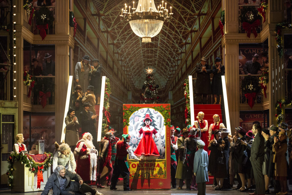 In einer Glitzer-Kaufhauswelt, in der Hoffmann als Kind sehnsüchtig vor den ausgestellten Puppen steht, wird das Wunder der Oper wiederum ins Reale wegerklärt. Das gilt umso mehr, als sie Hoffmann immer dann lebendig erscheint, wenn er die von Coppélius erworbene rosarote Brille aufsetzt. Aber auch hier gilt: Umgesetzt ist diese Idee meisterlich. Sáenz spielt die Puppe außerdem hinreißend und ist in einem der entzückendsten Kostüme des Abends (ja, entzückend! auch wenn es Weihnachtskitsch parodiert!) wunderhübsch anzusehen. Das gilt für den ganzen Konsumtempel und übrigens auch für Cochenille, der hier als Weihnachtsmann daherkommt und in Gestalt von Ya-Chung Huang mit großem Spaß über die Bühne fährt.