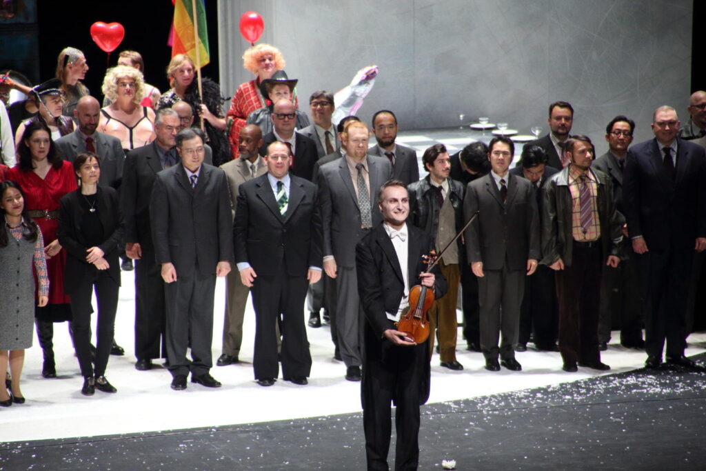 Das Orchester gab sich in feinster Spiellaune mit einem fantastischen Geigensolo auf der Bühne. Ein Straßenmusiker (Konzertmeister Konradin Seitzer) mit Nebenverdienst im Violinkoffer! – eine glänzende Idee – Dreimal jedoch gab es dicke Patzer aus dem Blechbereich beim Einsatz kurz hintereinander – das ist für ein „A-Orchester mit Zulage“ zu wenig.