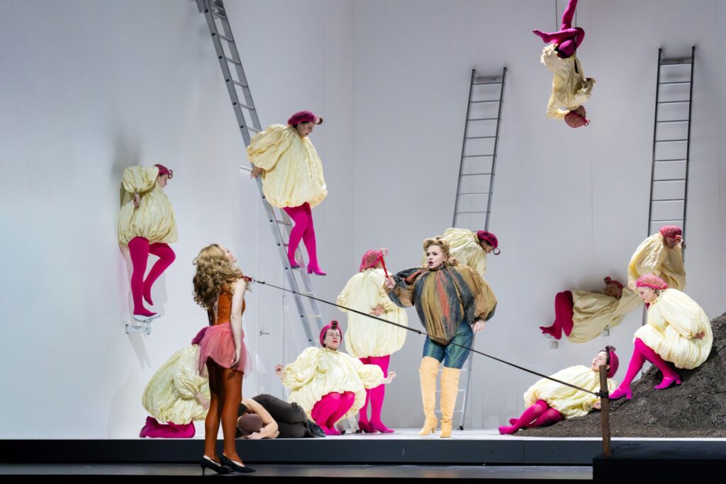 Die Inszenierung der Staatsoper unter Ted Huffman nimmt sich diesem nun an und liefert eine (leider nur mehr sehr selten) wunderbar verständliche Regiearbeit. Huffman verzichtet dankenswerterweise auf Plastiktiere oder angeklebte Fuchsschwänze, sondern lässt in einem minimalistischen, strahlend weißen Raum (Bühne: Nadja Sofie Eller) die Tänzer, Artisten und Sänger der Staatsoper in bunten Bodys in kunstvoller Choreographie durch den Raum tanzen.