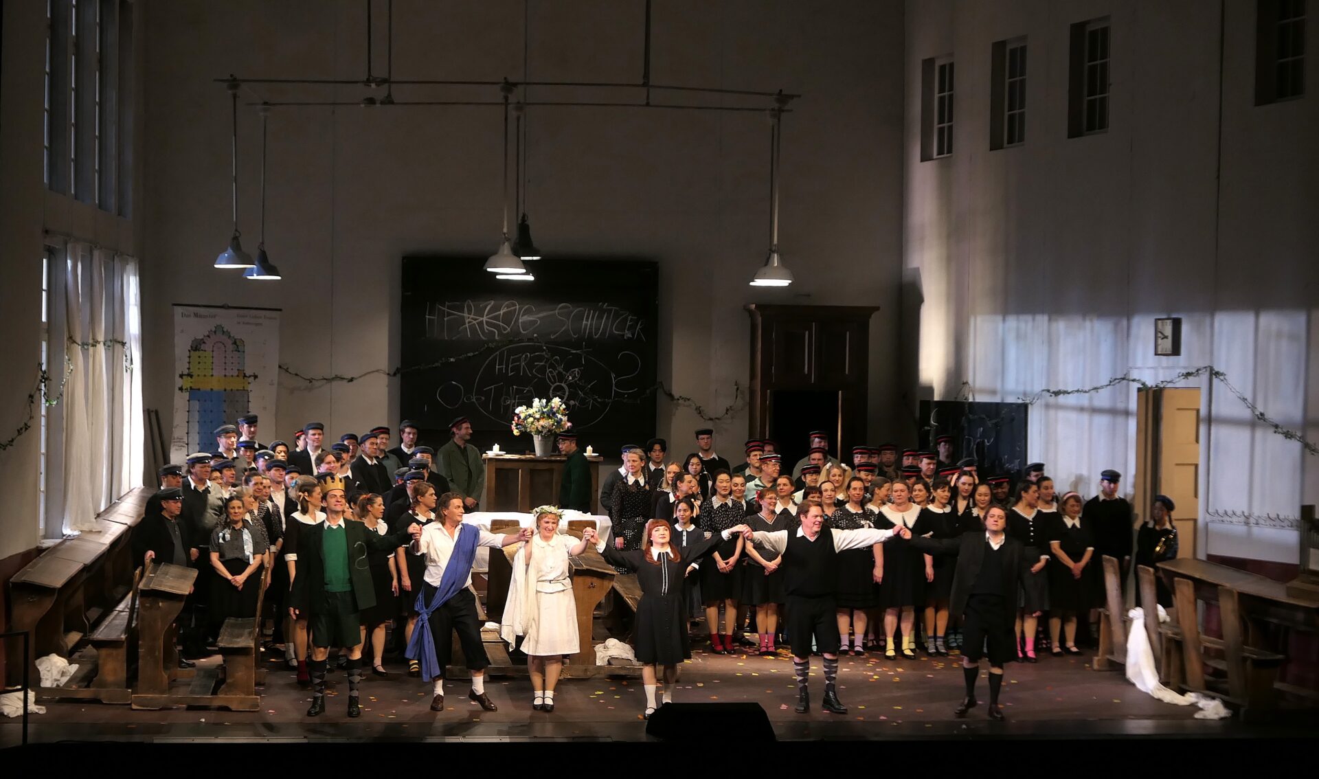 Nächstes Bild Lohengrin 28.03.26 Foto 1 Nach dem zweiten Aufzug: Gabor Bretz (König Heinrich), Klaus Florian Vogt (Lohengrin), Sara Jakubiak (Elsa), Yulia Matochkina (Ortrud), Martin Ganter (Telramund), Szymon Mechlinski (Heerrufer) (Foto: RW)
