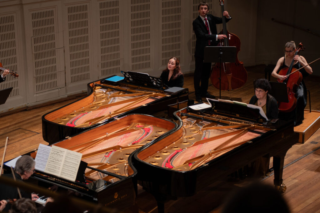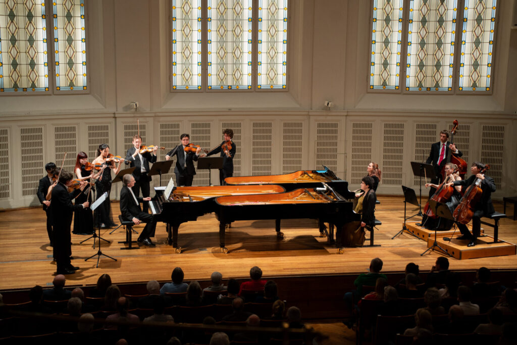 Drei Steinways in vorderster Front, elf Streicher im Halbkreis dahinter, und ein Komponist auf den Notenpulten, der mit polyphonem Dickicht umzugehen wusste wie andere mit der rechten und linken Schuhbindung. Dass der Saal nicht ausverkauft war, bleibt ein Rätsel – ein solches Programm, mit solcher Hingabe gespielt, hätte eine vollere Kulisse verdient.