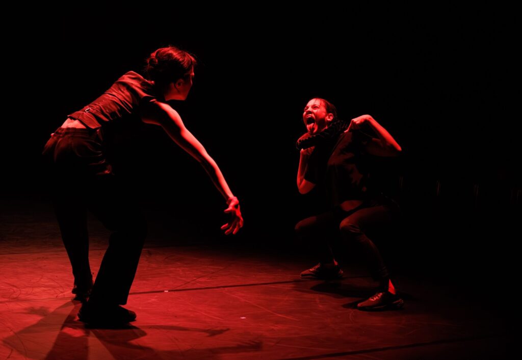 Nebel. Stille. Leere. Nichts. So lassen Ginevra Panzetti und Enrico Ticconi ihr Stück beginnen. Dann ein verwirrter schwankender Mensch. Er fällt. Sogleich bricht eine Horde Tänzerinnen und Tänzer brüllend schreiend durch den Vorhang, der die Bühne an der einen Seite des Quadrats abschließt, an dem kein Publikum sitzt. Dazu harte laute Beats. In dieser Choreografie ist die Mimik Bestandteil des inszenierten Körpers. Manchmal glaube ich mich in einer Fanschlacht zwischen gewaltbereiten Ultras zu befinden, manchmal knackt knisternd ein Lagerfeuer durch die Boxen. Ich wundere mich: warum macht das Stück einen so aggressiven Eindruck auf mich, wo es doch viele Stellen gibt, in denen sich die Tänzer und Tänzerinnen in Slow Motion die immergleiche Abfolge des Bewegungsmusters ausführen?