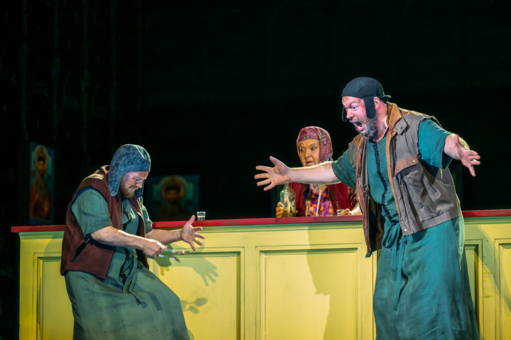 In den Bühnenbildern von Miriam Buether ist die Welt der Mächtigen klar von derjenigen der Armen getrennt: Oben eine goldene Kuppel als Zeichen für den Kreml, unten graue einengende Wände für den Lebensraum des armen Volkes. In den Kostümen von Nicky Gillibrand spiegelt sich dieser Kontrast genauso wider.