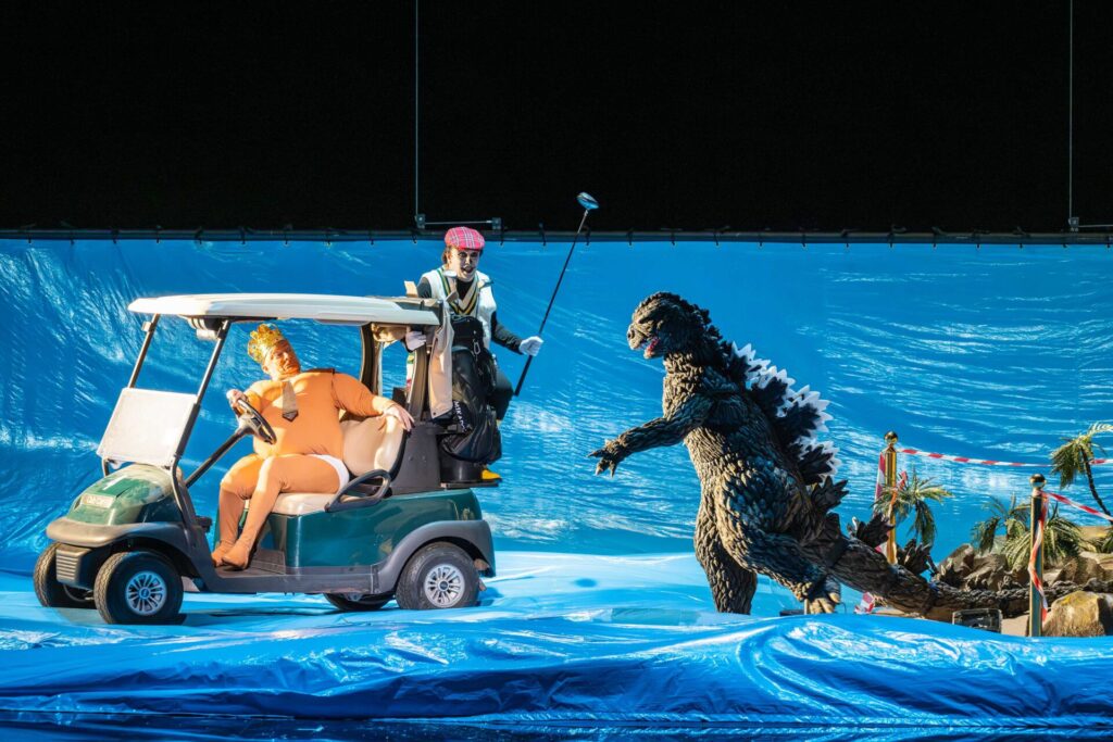 Liebenswert-spielerisch ist das Meer um Gorgonzillas Insel gestaltet, das aus einer großen Plastikplane besteht, die durch untergeblasene Luft bewegt wird – klar, das kennt man genauso aus der „Augsburger Puppenkiste“, nur dass es hier keine Jim Knopf-Insel mit zwei Bergen oder das Urmel-Eiland ist, sondern eher eine Art Utopia mit naturliebendem Monstrum.