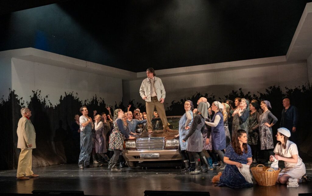 Markus Erik Meyer, verantwortlich für Bühnenbild und Kostüme, hat dem Regisseur dafür ein adäquates, die Düsternis unterstreichendes Bühnenbild geschaffen. Hohe, verschmutzte Wände sperren den Bühnenraum ab. Es gibt keinen Blick ins Freie. In der Mitte ist ein alter Mercedes, Statussymbol für Reichtum und Macht. In ihm findet die von Schostakowitsch so frech und schonungslos auskomponierte Beischlafszene zwischen Katarina und Sergej statt, die nicht pornographisch direkt dargestellt wird, den Zuschauer aber zum beobachtenden Voyeur macht. Eine kluge Lösung, die genug, aber nicht zu viel zeigt, und die Darsteller nicht als Person bloßstellt. Erst im letzten Bild ist der Mercedes nicht mehr auf der Bühne, die nach hinten weit in kaltes Licht getaucht ist, eisiges Licht über der russischen Steppe. Kälte umgibt die Gefangenen. Ein so einfaches wie sprechendes, atmosphärisches Bild. Die zeitlosen Kostüme zeichnen klar die hierarchische Stellung der Personen nach. Kittel und Overall für die Arbeiter und Arbeiterinnen, Anzug für den Gutsbesitzer.