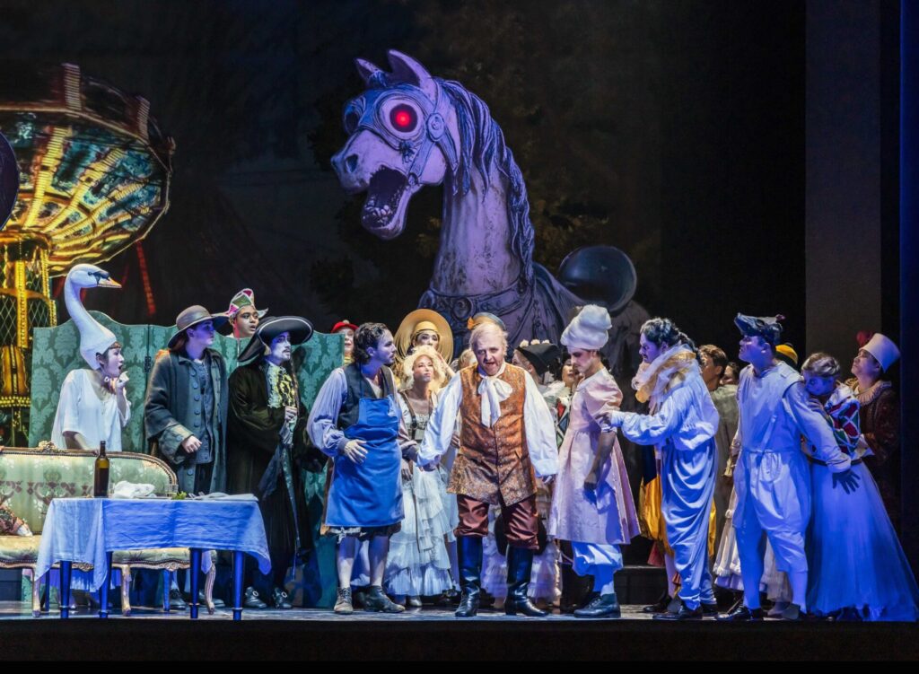 Aufrichtig gestanden: Dieser „Rosenkavalier“ bezaubert optisch durchweg durch eine prachtvolle, handwerklich meisterhaft gemachte Bühne (Stefan Rieckhoff), detailverliebt gestaltete Kostüme (Tanja Liebermann), eine lebhafte Chorographie (Kati Heidebrecht) und eine abwechslungsreiche Lichtregie (Falk Hampel). Wie im Original spielt die Handlung vornehmlich um 1740, weist aber auch durch den Blick in eine Wiener Straße mit entsprechender Architektur und Gaslaternen in das 19. Jahrhundert und damit die große Walzerzeit. Im Prater schließlich grüßt das frühe 20. Jahrhundert durch Riesenrad-Beleuchtung und schaurige rotäugige Glühbirnen-Figuren herein. Das Spiel mit pastelligen Tönen des Spätbarock und kräftigen Koloriten, die vom Fin de siècle in die Jetztzeit führen, unterstreicht optisch den glanzvollen Reichtum der Klangfarben in der Partitur.
