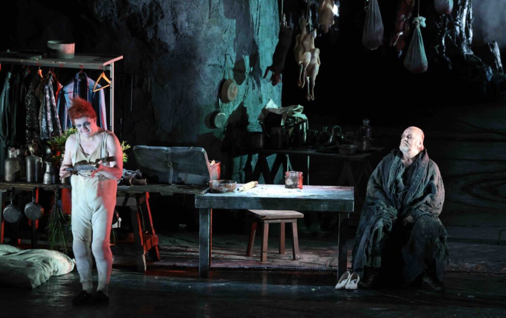 Die Ermordung des verwandelten Riesen Fafner – wohltönend und bedrohlich gesungen von Ain Anger – stellte den Regisseur David McVicar vor die Frage: Wie weit soll die Illusion des Märchens gewahrt bleiben?
