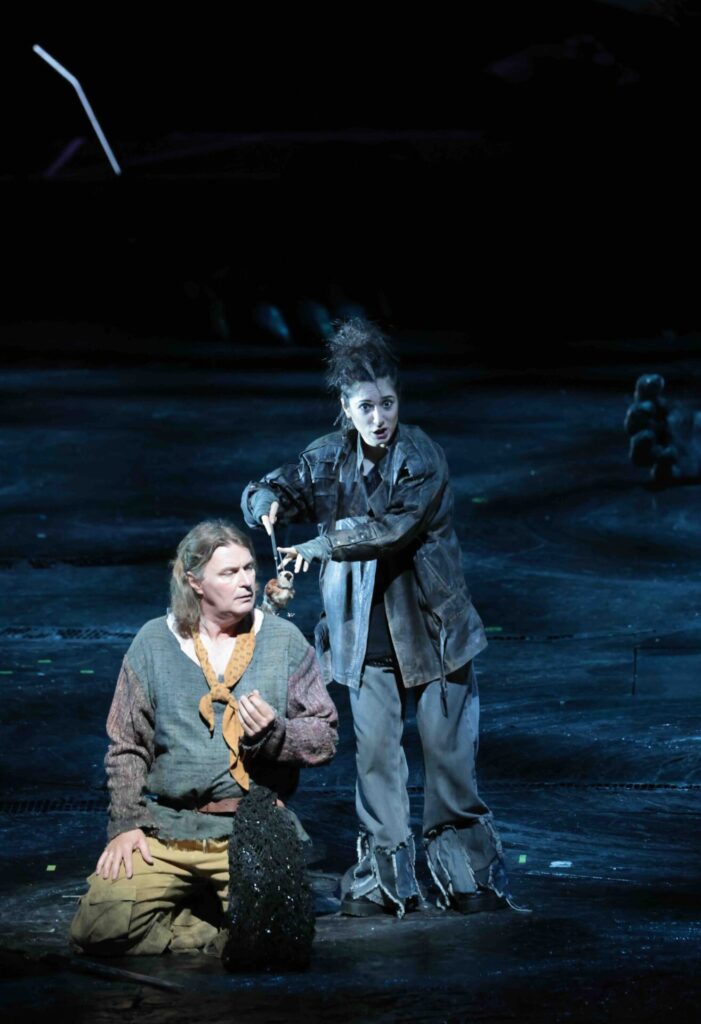 McVicar entschied sich dafür, den Theatermechanismus offen zu zeigen: Der riesige Wurm wird deutlich sichtbar von etlichen Bühnenarbeitern manipuliert. Warum der Drache bereits bei seinem ersten Erscheinen als totes, skelettiertes Ungeheuer präsentiert wird, hat sich mir allerdings nicht erschlossen. Der Waldvogel singt nicht – wie so oft – unsichtbar vom Schnürboden herab, sondern erscheint leibhaftig in der entzückenden Gestalt von Francesca Aspromonte auf der Bühne: mit punkigem Irokesenschnitt, begleitet von einem Bühnenarbeiter, der ein kleines Vöglein an einer Stange flattern lässt. Eine verspielte Lösung, die den Zauber der Natur einfängt, ohne ihn zu verstecken.