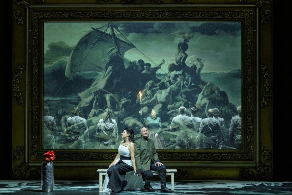 Den zweiten Akt dominiert auf der Bühne die Projektion von Géricaults monumentalem Bild „Floß der Medusa“ im Goldenen Prunkrahmen. Vernichtung, Entmenschlichung, Untergang heraufbeschwörend, erschließt sich dieser Einfall im Zusammenhang mit dem zentralen Thema der Oper, der alle Konventionen sprengenden Liebe, nicht.
