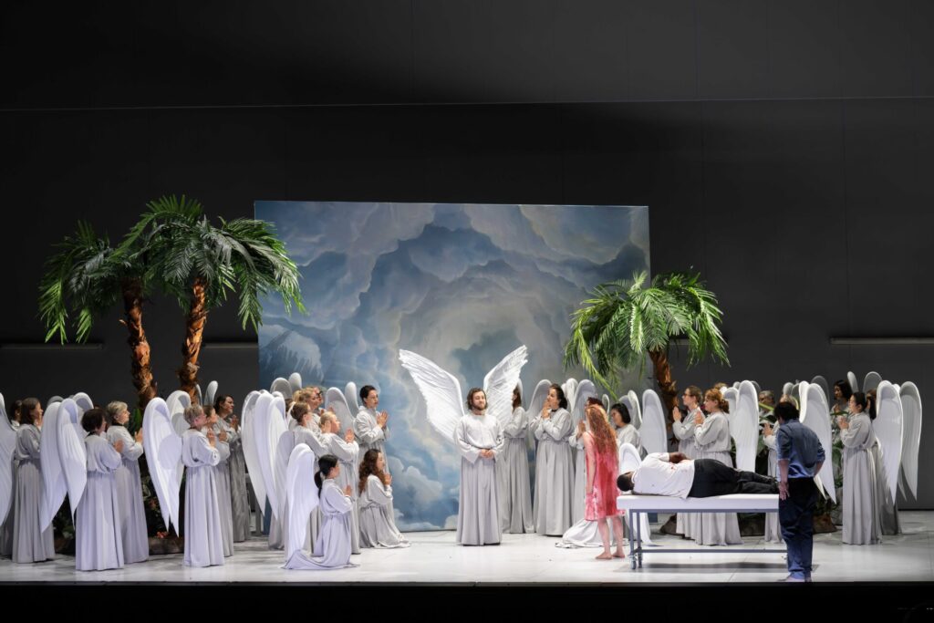 Abgesehen von allen überraschenden Aspekten der Inszenierung – die Übertragung in unsere Zeit gelingt einwandfrei. Für diejenigen, die in der Corona-Zeit ohne persönlichen Abschied geliebte Menschen loslassen mussten, war der zweite Teil sicher am eindrücklichsten. Auch die ironischen Brechungen, das Spiel mit dem Kitsch von Himmels- und Engelsdarstellungen aus dem 19. Jahrhundert, vor allem das Auflösen der himmlischen Verheißung als blanke Illusion der Hauptdarstellerin, all das schafft eine Distanz zur märchenhaften Handlung und zugleich die Nähe zu den Figuren als echte Menschen. Hier geht es um das wirkliche Leben – besser kann man das nicht in Szene setzen.