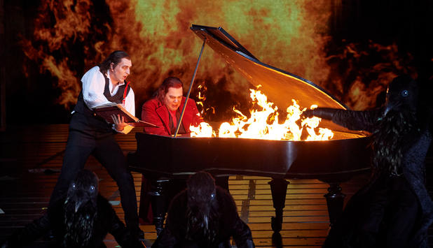 Rot ist das Outfit Caspars, rot ist aber auch die Farbe der Stühle für den Chor, der das kritische Opernpublikum darzustellen hat.