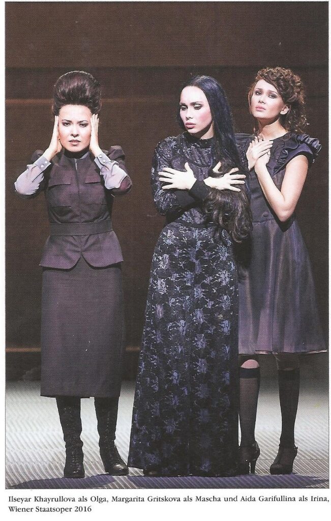 Es vergingen zwei Jahre. Ihre Interpretation der Olga in Péter Eötvös’ “Drei Schwestern“ spannte den Bogen zu dem Weinheber-Gedicht „Kammermusik“, indem wir die zweite Geige zitierten: „Mir, neben lichterm Wesen, ist verwehrt ein Ich zu haben. Nicht die Welt – doch fester und wirklicher die Erd hat mich belehrt. Dort dunkelt es, lass dich begleiten, Schwester.“ Die Rolle der Olga hat keine eigene Sequenz. Dass die älteste Schwester einer jungen und nicht einer schon arrivierten Sängerin anvertraut wurde, war eine begrüßenswerte künstlerische Herausforderung. Ihre tiefe, schöne Altlage hatte jedoch unserem Urteil nach noch nicht die Durchschlagskraft für höhere, schwerere Aufgaben.