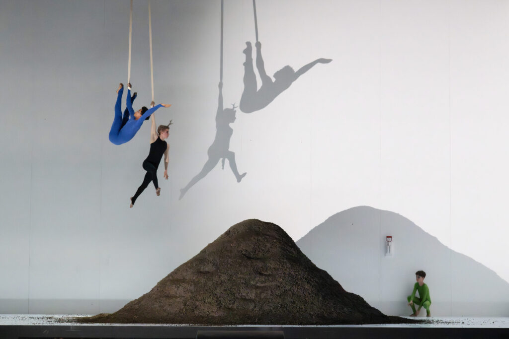 Ein einsamer Erdhaufen weckt bei mir zunächst Assoziationen an Samuel Becketts Drama „Glückliche Tage“, in dem nur der Kopf einer Frau aus einem solchen Haufen ragt. Aber mit etwas Fantasie mag man darin auch einen übergroßen Pilz erkennen, der dem Regieteam wohl vorschwebte. Immerhin ein grüner Vorhang auf Nadja Sofie Ellers sparsam ausgestatteter Bühne deutet darauf hin, dass wir uns im Wald befinden. So lasse ich mir moderne Opernregie gefallen. Es bleibt so manches abstrakt und skizzenhaft, aber es ist alles da, was es braucht und richtet sich nichts gegen die Musik. Allein das ist in heutigen Zeiten viel.