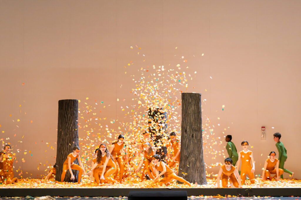 Seine Kraft entfaltet die Produktion vor allem aus starken choreografischen Elementen, wenn der Wald zum Leben erwacht, ihn seine zahlreichen Bewohner bevölkern, Frösche, Füchse, Hase, Bär, Heuschrecke und Schnecke, denen Kinder und Akrobaten fantasiereich Gestalt geben. Viele von ihnen laufen mit angewinkelten Beinen auf Händen, andere schlagen Räder oder hüpfen munter durcheinander. Und die weniger fassbaren Wesen der Lüfte machen an zwei Seilen mit virtuoser Akrobatik wie aus einer Zirkusarena Staunen. Die mit der Staatsoper kooperierende Staatliche Ballett- und Artistikschule bildet dafür zusammen mit Mitgliedern des Opernstudios und dem Kinderchor der Berliner Staatsoper eine imposante Phalanx.